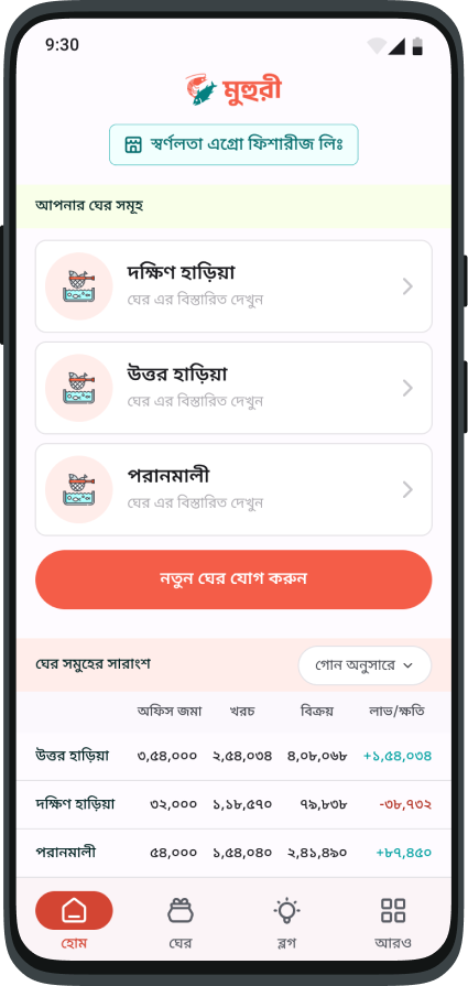 ঘের আপনার, হিসাব রাখার দায়িত্ব মুহুরীর। মুহুরী অ্যাপের মাধ্যমে আপনার ঘেরের সকল হিসাব রাখতে পারবেন আরো সহজে ও নিরাপদে। তাই আরো দক্ষভাবে ঘের পরিচালনা করুন মুহুরীর মাধ্যমে।
